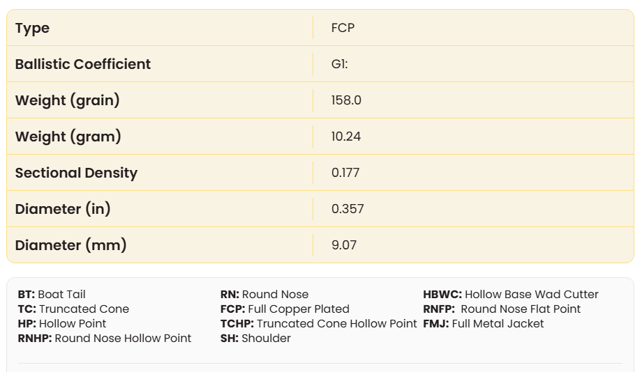 Kaliber: .357 • Vægt: 158 gr • Type: RNFP • Kobberbelagt blykerne.