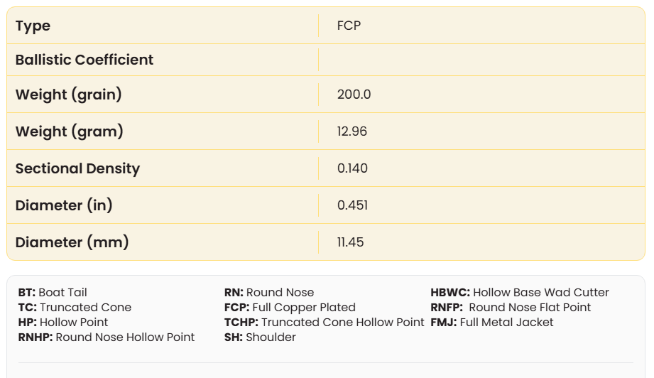 Campro .451 200gr FCPTC er en kobberbelagt projektil i .45 kaliber, udviklet til præcis og pålidelig genladning. Den flade spids og truncated cone (TC) profil sikrer stabil fødning og ensartet funktion, især i halvautomatiske pistoler som .45 ACP.