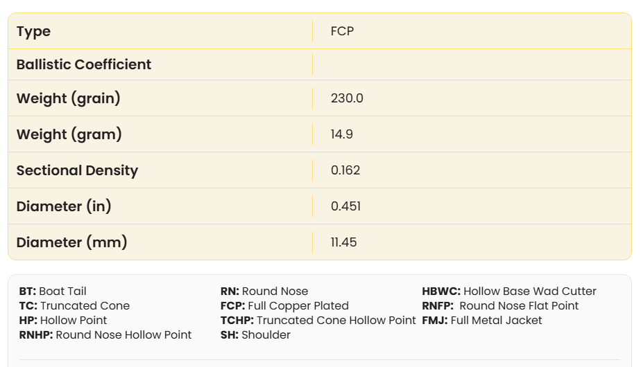 Den kobberbelagte overflade reducerer blyaflejringer i løbet og sikrer en renere skydning sammenlignet med traditionelle blyprojektiler. Med en vægt på 230 grains får du en klassisk .45 ACP ladning med god balance mellem rekyl, funktion og præcision.