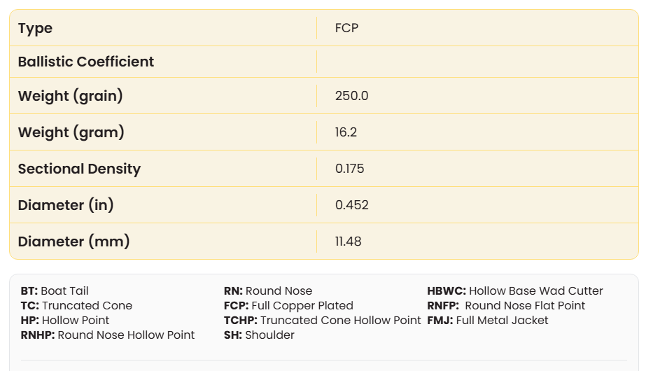 Med en vægt på 250 grains er den velegnet til klassiske .45 kaliber ladninger, hvor der ønskes en god balance mellem rekyl, præcision og energi. Projektilens form gør den alsidig og pålidelig i mange forskellige våbentyper.