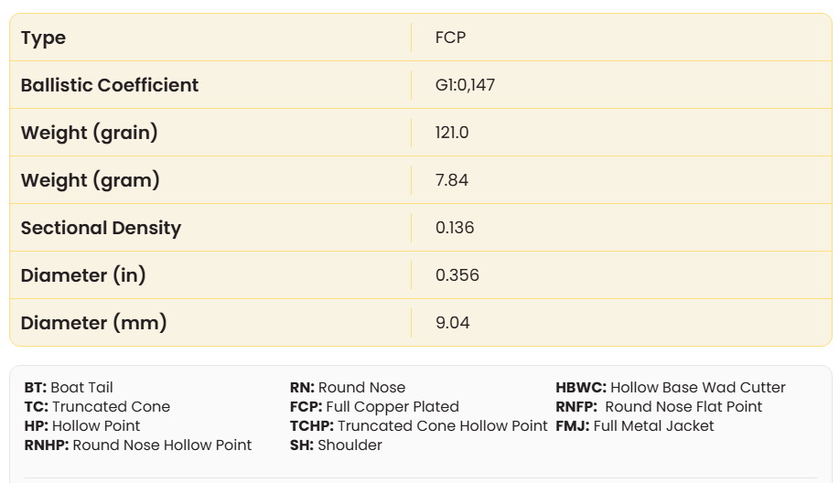 9 mm projektil på 121 grain (ca. 7,8 g) med HBRN (Hollow Base Round Nose) profil og Full Copper Plated (FCP) overflade. Den kobberbelagte konstruktion reducerer aflejring i løbet og giver en renere skydning. Hollow base‑designet hjælper projektilen med at udvide sig let i bunden ved affyring, hvilket giver bedre tætning i løbet og stabil præcision.